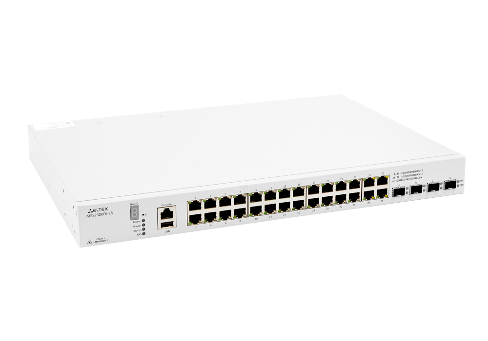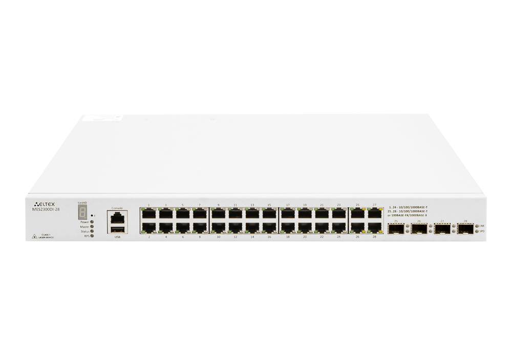 Ethernet-коммутатор MES2300DI-28, 24 порта 10/100/1000Base-T, 4 комбо-порта 10/100/1000 Base-T/100/1000 Base-X (SFP), L3, 2 слота для модулей питания.