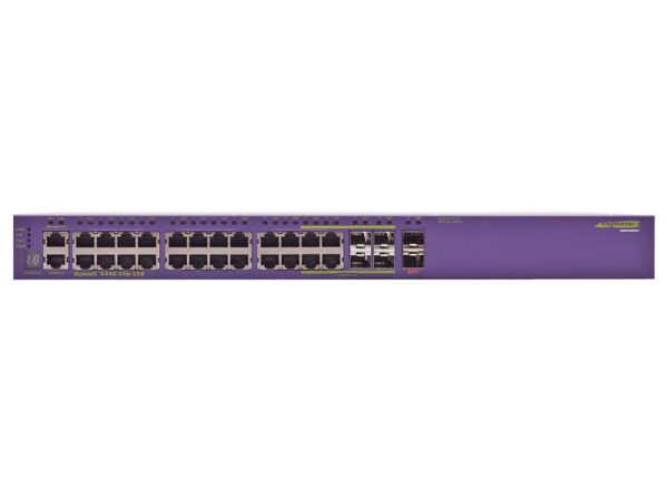 24 10/100/1000BASE-T PoE-plus, 2 4 1000BASE-X unpopulated SFP (2 4 SFP ports shared with 10/100/1000BASE-T ports), 2 10GBASE-X SFP+, 1 AC PSU, ExtremeXOS Edge license, connector for external power supply