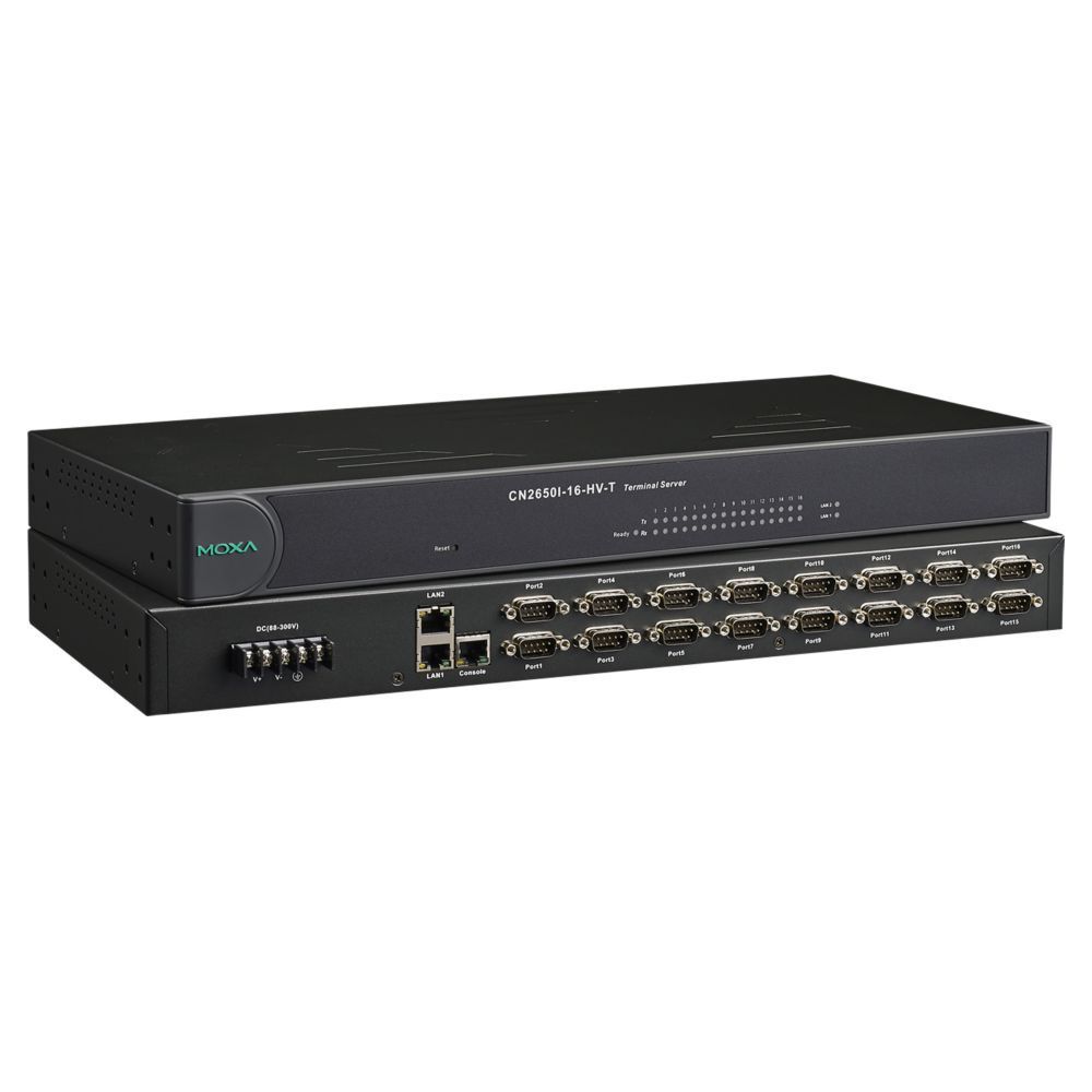 16-портовый сервер MOXA CN2650I-16-HV-T — RS-232/422/485 в Ethernet с двумя независимыми LAN с изоляцией 2 КВ, Dual 10/100M Ethernet, с питанием 110 В пост. (88 ~ 300 В пост.), с расширенным диапазоном температур t: -40/85