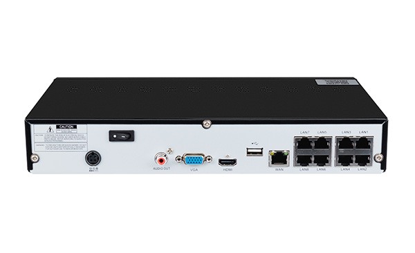 Сетевой видеорегистратор, 8 каналов записи, 1 слот SATA, емкость HDD до 8 Тб, H.264/H.265, 1 порт 10/100/1000BASE-T, 8 портов 10/100BASE-T PoE 802.3af, VGA, HDMI, 2 порта USB 2.0, внешний БП, 48В DC
